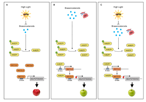 该研究建立了以MdBZR1–MdCOL6复合体为核心的分子调控模型(图2),通过整合BR和光信号以调节苹果中花青苷的生物合成。阐明了花青苷生物合成调控过程中光和BR信号整合的分子基础,为苹果果实营养品质的遗传改良提供理论依据。