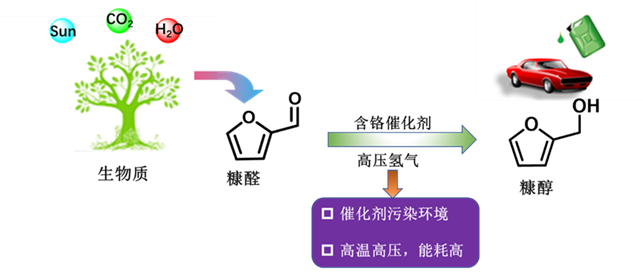 糠醛作为重要的生物质衍生物,可以通过催化加氢反应制备出各种高附加值的化学品。其中,工业上由糠醛制糠醇通常采用铬酸铜(CuCr2O4)作为催化剂,在高压氢气条件下进行,该方法面临着诸多问题(图1)。因此急需发展绿色高效的方式,实现糠醛选择性加氢制备糠醇。