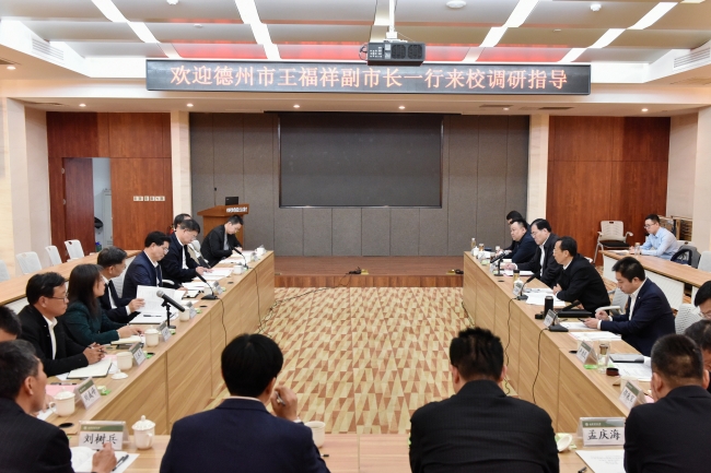 近日,德州市委常委、副市长王福祥带队来校,就共建小麦产业研究院进行考察对接。学校党委书记徐剑波会见王福祥一行。党委副书记、校长冷畅俭主持座谈会,学校党委常委、副校长李向东参加座谈。