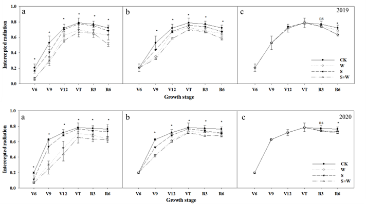 图2. 不同生育时期遮阴、淹水及其复合胁迫对夏玉米光能截获的影响