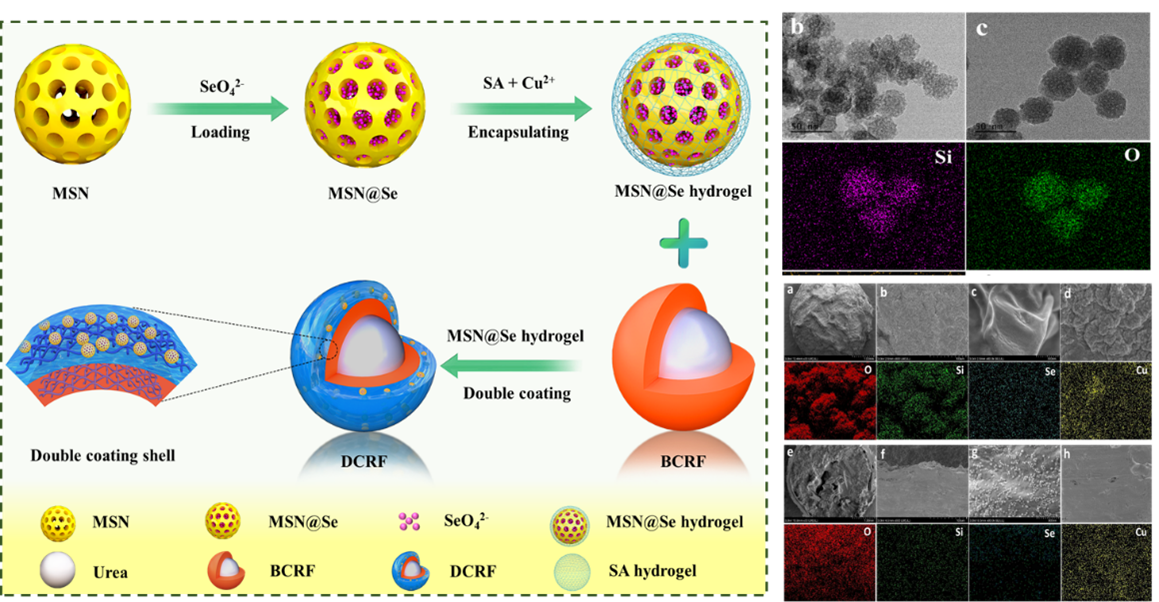 针对上述问题,杨越超教授团队制备了一种多功能双层生物基包膜控释肥,该肥料同时具备缓释氮、硒和铜元素的能力。该肥料为以尿素作为肥料的核心,生物基聚氨酯作为内涂层,藻酸钠和铜离子形成水凝胶作为外涂层制备而来。此外,负载硒酸钠的介孔二氧化硅纳米颗粒被用于修饰海藻酸钠水凝胶(MSN@Se水凝胶)。