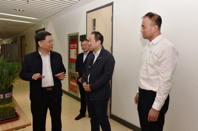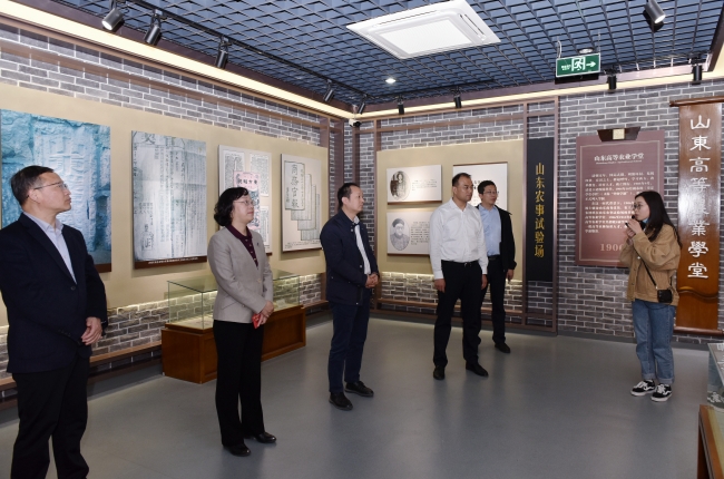 蒋宏潮先后到校史馆、小麦育种全国重点实验室实地考察,参观学校校史馆展陈情况,听取学校“初心课堂”的建设情况讲解,查看学校科研条件,与小麦遗传改良及基因组学孔令让教授团队、果树种质资源与遗传育种陈学森教授团队交流,了解他们的科研成果、工作思路等情况。他对山东农大悠久的办学历史、深厚的文化底蕴和取得的发展成就给予充分肯定,希望山东农大进一步增强使命担当,以立德树人为根本,以强农兴农为己任,坚定理想信念,努力培养担当民族复兴大任的时代新人。
