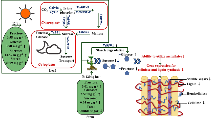 叶片进行光合作用合成淀粉,多余的淀粉被降解并输出,这增加了叶片的可溶性糖含量,其中的蔗糖被向外转运。茎秆利用叶片转运的蔗糖进行生物合成。氮肥增加了叶片可溶性糖含量,即增强了叶片生产同化物的能力。
