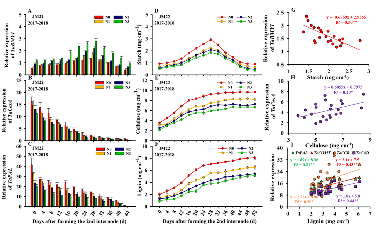 图1. 施氮量对茎秆基部第二节间碳水化合物含量、基因表达的影响