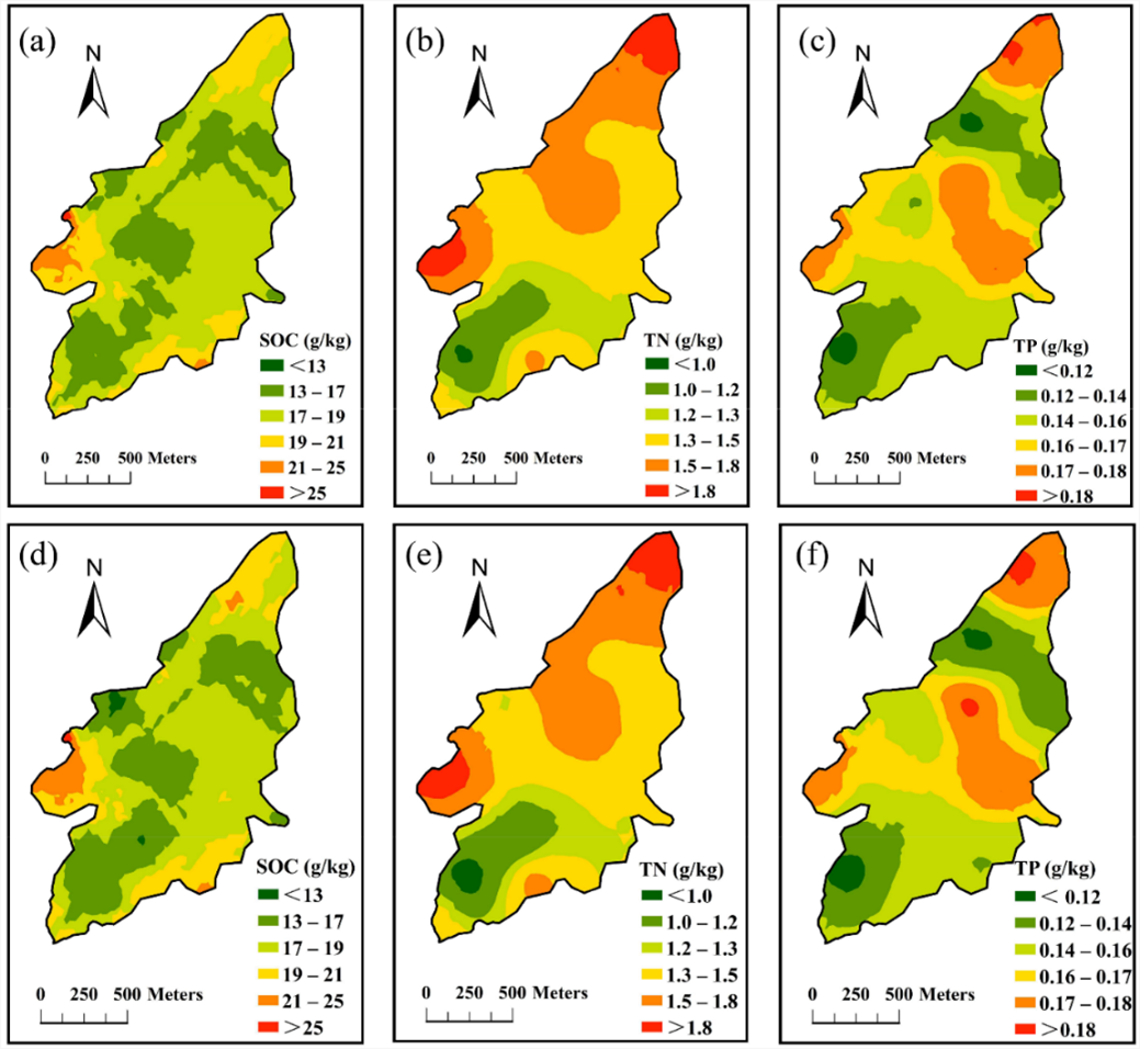 图3. 海岸带防护林基于普通克里格法和普通协克里格法的SOC、TN和TP空间预测