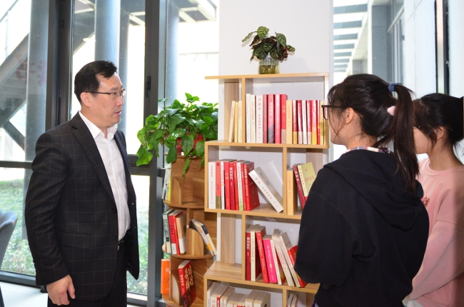 主题团日活动结束后,徐剑波来到经管学院“润心”读书角,十几个青年学生正在这里进行读书班读书分享会。