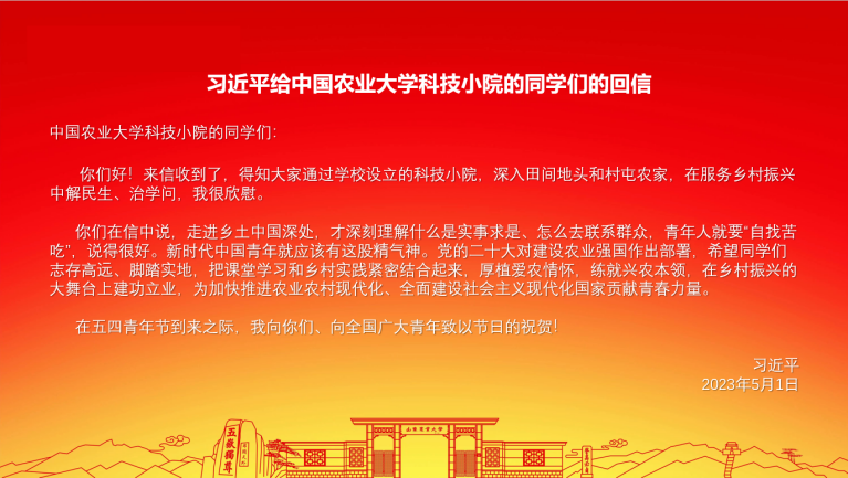 中共中央总书记、国家主席、中央军委主席习近平近日给中国农业大学科技小院的同学们回信,在beat365英国官方网站广大青年学生中引起热烈反响。在全国重点实验室、在学校各个科技小院实验站点、在青年学生活动场所...广大青年学生自发组织起来认真学习、广泛热议回信精神,同学们纷纷表示,要牢记习近平总书记殷殷嘱托,志存高远、脚踏实地,厚植爱农情怀,练就兴农本领,在服务乡村振兴战略,推进农业农村现代化建设,全面建设社会主义现代化国家的实践中贡献青春力量。