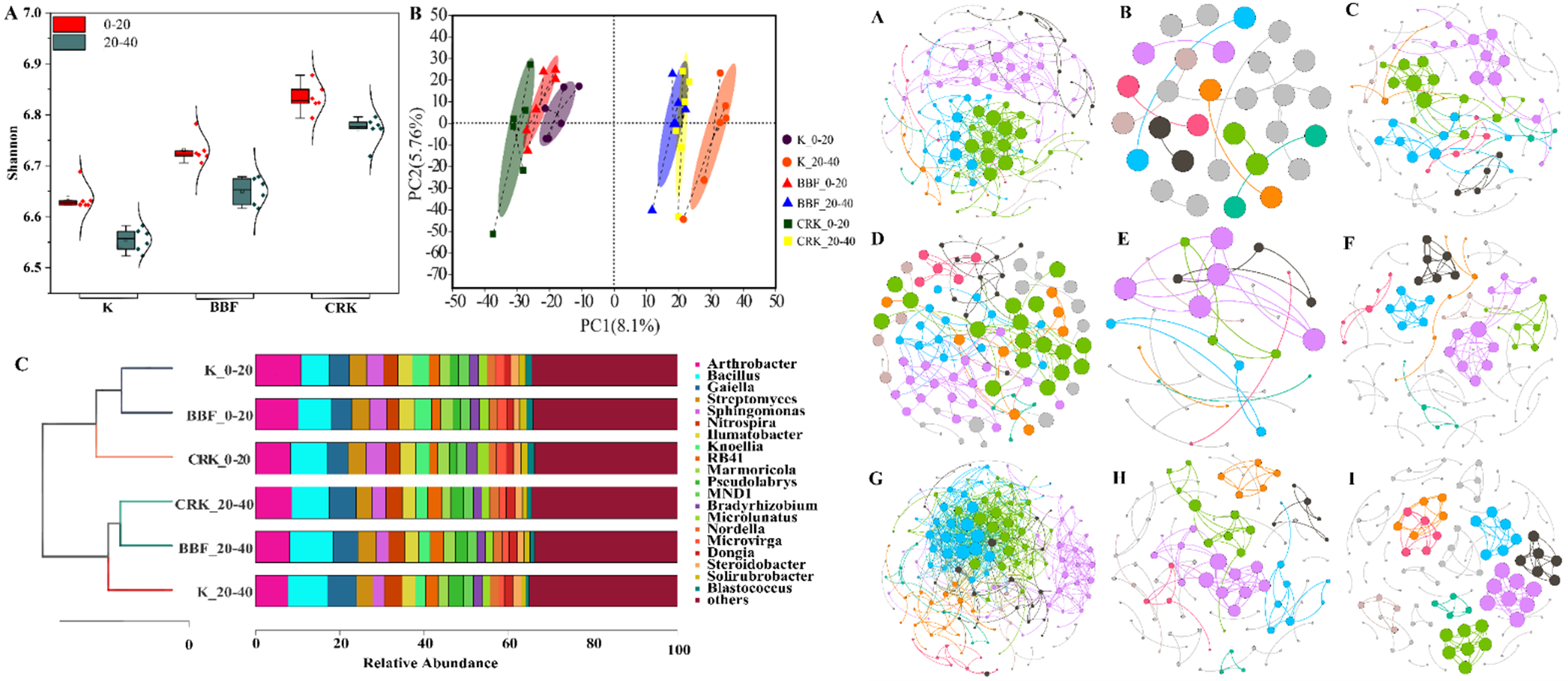 图1. 控释氯化钾对土壤细菌群落多样性及相对丰度、共生网络的影响