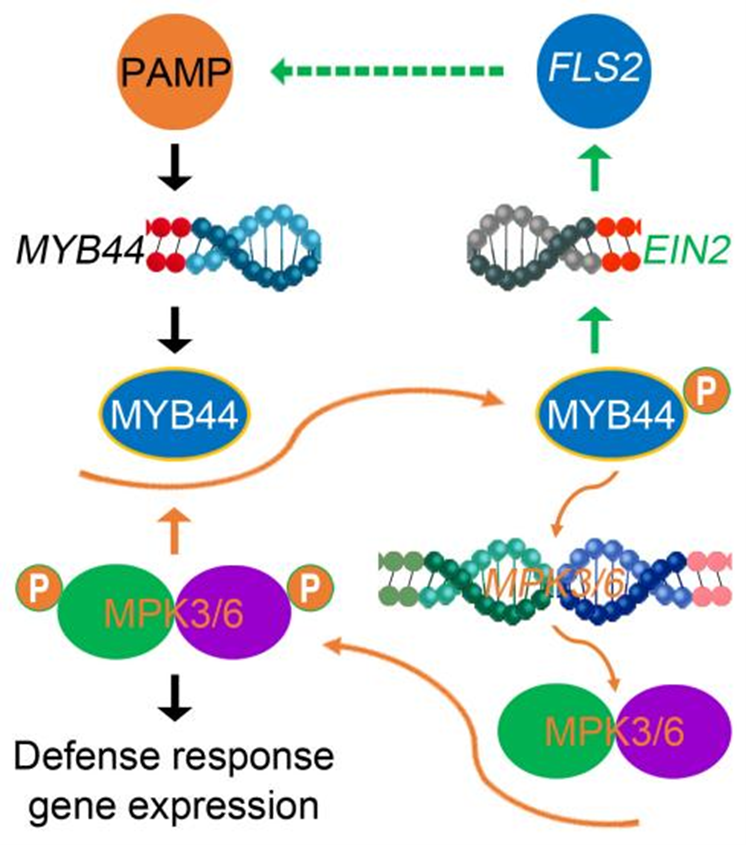 植物在感受到病原菌保守分子模式后,MYB44可以直接结合MPK3和MPK6基因的启动子区促进其转录;同时,MPK3和MPK6以功能冗余的方式磷酸化MYB44,进一步提高其促进MPK3和MPK6转录的活性,增强MAPK级联反应,激活植物免疫。此外,研究人员发现MYB44还可以通过促进乙烯信号途径重要调控基因EIN2的表达增强植物PTI。该研究阐明了PTI过程中MAPK级联反应调控新机制,丰富了植物先天免疫调控机理的理论体系,也为植物抗病新途径的建立提供了科学依据。