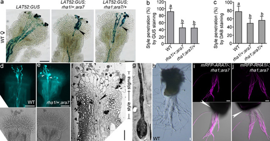 图1. 经典Rab5成员RHA1和ARA7功能缺失导致花粉管不能穿过花柱