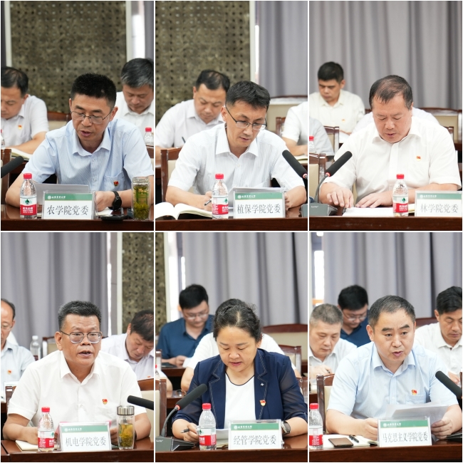党委常委、宣传部部长李广松,党委常委、组织部部长张铁成,各基层党委(直属党总支)主要负责同志以及学校主题教育领导小组办公室有关同志参加会议。会上,农学院、植保学院、林学院、机电学院、经管学院(商学院)、马克思主义学院等6个学院的党委负责同志作了交流发言。