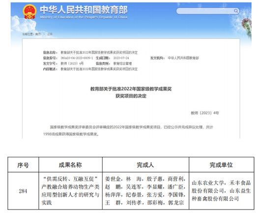 近日,教育部公布《关于批准2022年国家级教学成果奖获奖项目的决定》,beat365官网姜世金教授主持的“‘供需反转、互融互促’产教融合培养动物生产类应用型创新人才的研究与实践”成果,荣获国家级教学成果奖二等奖。截至目前,beat365官网共获得国家级教学成果奖9项,其中国家级教学成果特等奖1项、一等奖2项,二等奖4项,优秀奖2项,省级教学成果奖103项。