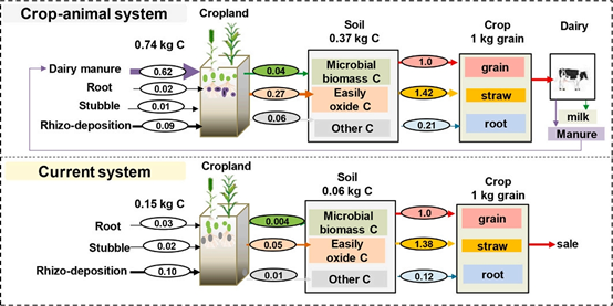 合适的农业废弃物管理模式对缓解气候变化、确保粮食安全至关重要。“作物秸秆-畜禽-粪便-农田”是一种很有前景的碳管理模式。在该模式中,畜禽养殖系统可将作物秸秆作为畜禽饲料,既减少了“人畜争粮”的矛盾,也减少对大豆或草等高碳足迹饲料的依赖;作物系统可循环利用来自这些农田副产物的畜禽粪便,从而减少由化肥使用而造成的温室气体排放。然而,我国当前农牧分离较为严重,不同农业废弃物管理模式对碳固存的影响尚不清楚。因此,亟需寻找一种最佳的农业废弃物管理模式促进农业生产和缓解气候变化。