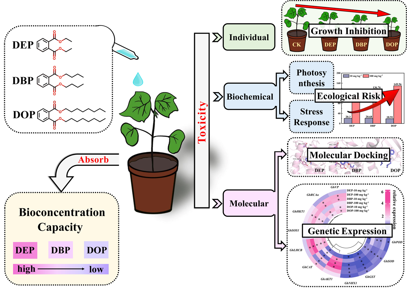 黄河三角洲是黄河流域的重要组成部分,其生态环境脆弱、土壤污染和盐渍化问题严重制约了区域社会经济的可持续发展。目前,有关黄河三角洲地区酞酸酯的生态风险及环境危害还缺乏系统研究。对此,本研究围绕黄河流域生态保护和高质量发展的国家战略,针对黄河三角洲地区土壤酞酸酯污染问题,选取棉花(Gossypium hirsutumL.)为模式生物,分别从个体、生理生化以及分子水平全面揭示了典型酞酸酯(DOP、DBP和DEP)对棉花幼苗的毒性效应及其作用机制。