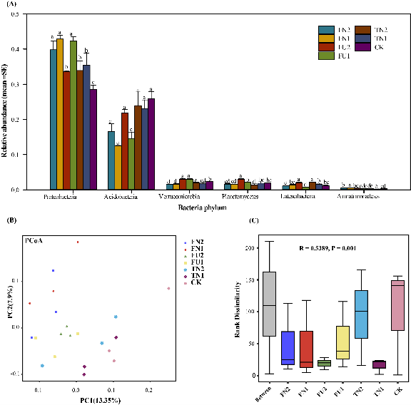 该研究表明,施氮方式、氮肥类型和施氮量均对N2O排放通量和NH3挥发造成显著影响(图2)。微喷水肥一体化显著降低了夏玉米季N2O排放通量和NH3挥发量。与传统施肥方法相比,微喷水肥一体化施用尿素处理的总NH3挥发量和累积N2O排放量分别显著降低了19.0%和34.2%。与施用尿素处理相比,施用UAN进一步降低了N2O累积排放量和NH3挥发量。同样,NH3挥发和累积N2O排放通量也受施氮量的显著影响。此外,施氮影响细菌群落的多样性和丰富度。在传统施肥方法下,施氮量对细菌多样性和丰富度没有显著影响。然而,在微喷水肥一体化条件下,细菌α多样性指数对施氮量的响应随氮肥类型的不同而不同。施氮量对细菌群落α多样性的影响也因施氮方式的不同而不同,微喷水肥一体化减氮处理更利于保持细菌群落多样性和丰富度。与此同时,施氮增加了变形菌门的相对丰度,降低了酸杆菌门的相对丰富度。与尿素相比,UAN处理显著增加了土壤中疣微菌门和浮霉菌门的相对丰度。与传统施肥处理相比,在微喷水肥一体化施用尿素增加了变形菌门的相对丰度,降低了酸杆菌门的相对丰度(图2)。相关性分析进一步表明,细菌群落多样性以及门水平差异微生物等与夏玉米产量和气态氮损失均具有相关性(图3)。总之,微喷水肥一体化施用UAN可以提高夏玉米产量,节省氮肥,是一种有效的农业可持续的氮肥管理措施。