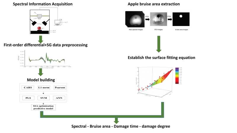 苹果在采摘、包装、运输等过程中极易发生损伤,而损伤面积是果品品质与等级评定的重要指标之一。苹果轻微机械损伤由于表面轻微凹陷、损伤面积小、无汁液外溢,传统机器视觉技术对损伤的识别精度较低,影响了苹果品质分级的准确性和效率。基于此,本文提出了一种高光谱结合机器学习的苹果轻微损伤面积快速准确预测方法,为果品分级提供关键理论支持。