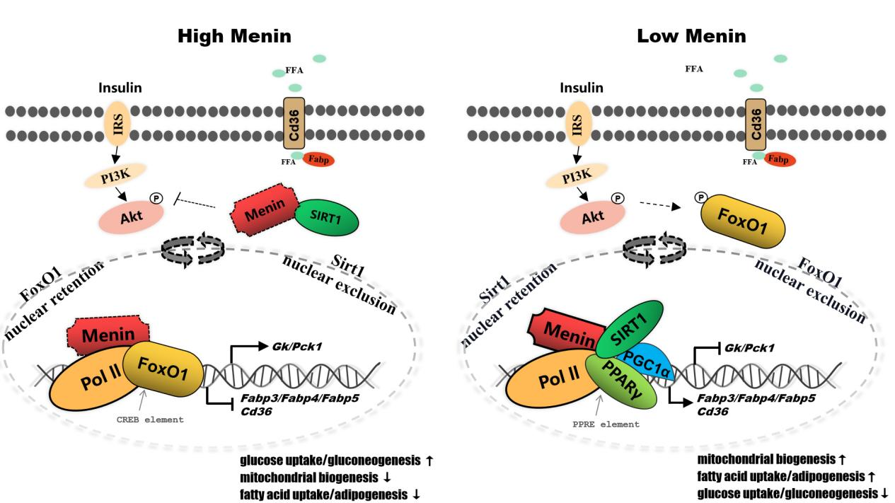 Menin是由Men1基因编码的支架蛋白,以“抑癌基因”的角色募集丰富的转录因子(互作)参与基因的表观遗传修饰,通过激活或抑制基因的表达而广泛调控细胞的生命活动。Menin的功能突变或缺失导致多发性内分泌腺瘤病Ⅰ型(MEN1),对于机体的代谢具有重要的调控功能。例如,肝组织特异性Menin缺失或肝细胞特异性Menin缺失都易发(非酒精性)脂肪肝,同时伴随胰岛素抵抗和Ⅱ型糖尿病表型。这表明Menin与肝脏代谢稳态之间的潜在联系。该研究发现Menin可以调控肝细胞的代谢稳态,“运筹帷幄”肝脏糖代谢与脂代谢之间的局势,扮演“谋局者”的角色。肝细胞Menin既可以通过与细胞能量传感器SIRT1、PPARγ相互作用来靶向脂质转运蛋白Fabp3/4/5以及Cd36的表达,从而调控脂质的吸收与代谢;又可以与FoxO1相互作用来靶向Gk、Pck的表达,从而调控葡萄糖的吸收与代谢。不仅如此,Menin还可以募集和部署这些互作蛋白在胞质/胞核中的分布,通过协调肝细胞对葡萄糖和脂肪酸的摄取进而调控细胞的代谢稳态。