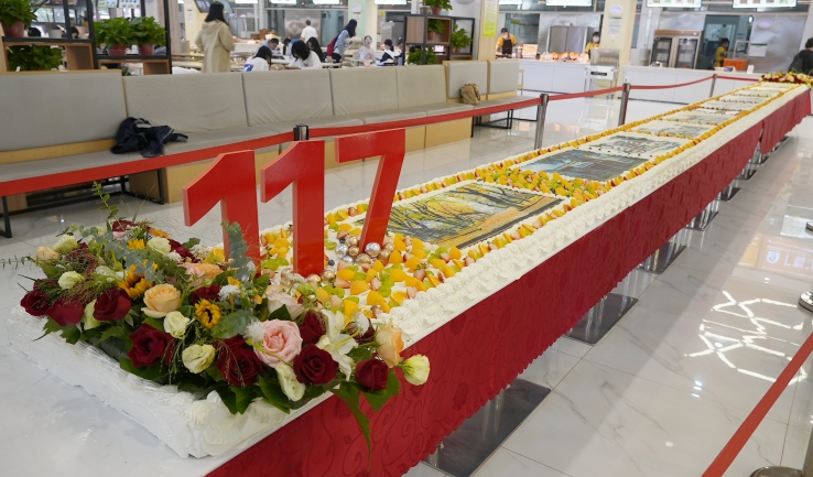 学校后勤管理处精心设计、倾情制作11.7米巨型庆生蛋糕,上有校徽、校训、“117”校庆标识等元素。琳琅精致的水果装点、连绵不绝的奶油浪花象征着一代又一代“后浪们”涌入beat365英国官方网站又奔赴远方,代表着学校对莘莘学子们的美好祝福和期盼。蛋糕正上方由学校标志性景物手绘图组成,两侧两束盘花,寓意着beat365英国官方网站117年不懈奋斗、砥砺前行,向着一流农业大学奋勇前进的精神风貌。