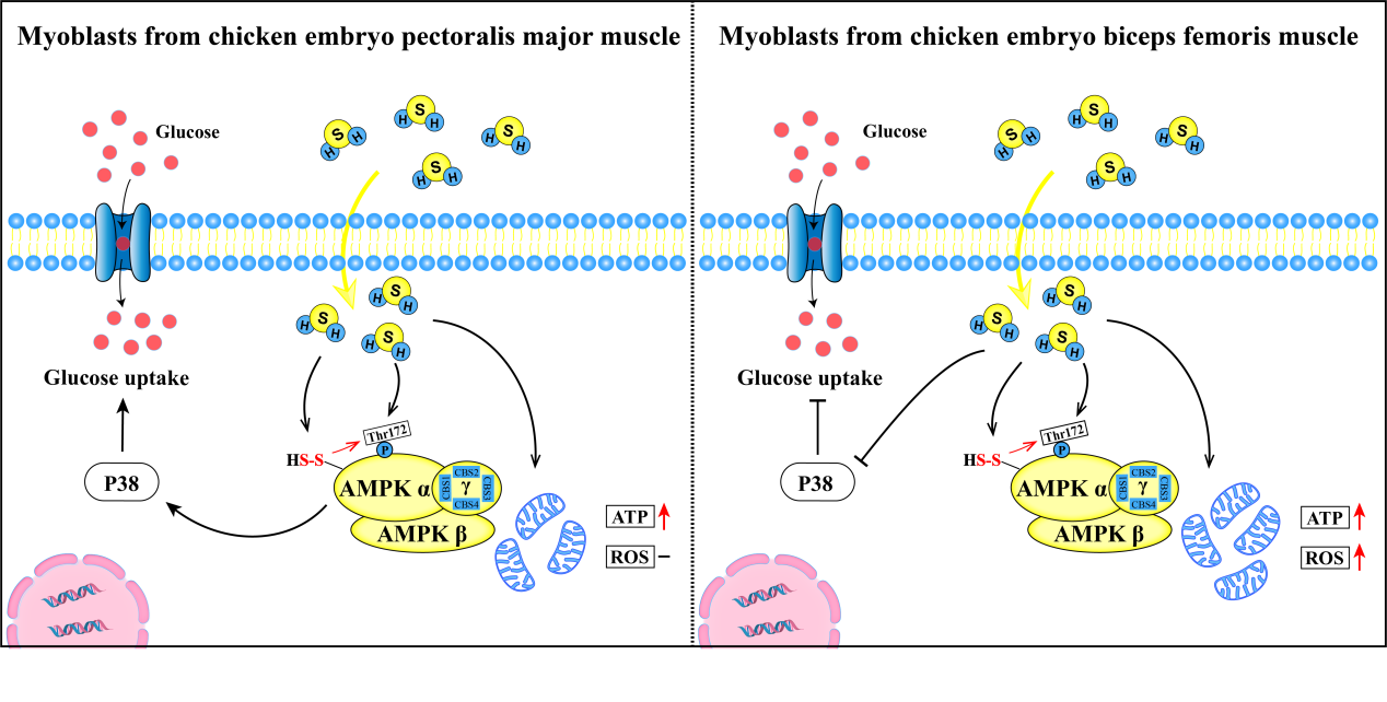 与哺乳动物相比,鸡的血糖和胰岛素水平较高,肌肉对胰岛素的低敏感性使其成为潜在的胰岛素抵抗模型。肉鸡胸大肌主要是快缩糖酵解型肌纤维,而股二头肌主要是慢缩氧化型肌纤维,其代谢特点不同,该研究发现H2S促进胸大肌成肌细胞葡萄糖摄取,抑制股二头肌成肌细胞葡萄糖摄取。