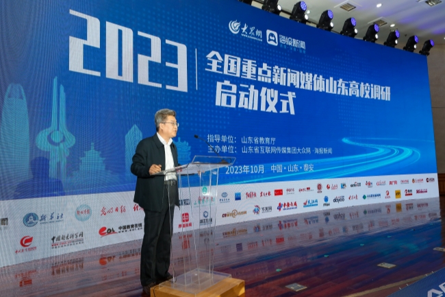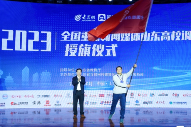 beat365英国官方网站党委书记徐剑波出席发布会并致辞,向参加2023全国重点新闻媒体山东高校调研的媒体代表授旗。党委副书记、校长冷畅俭主持发布会。