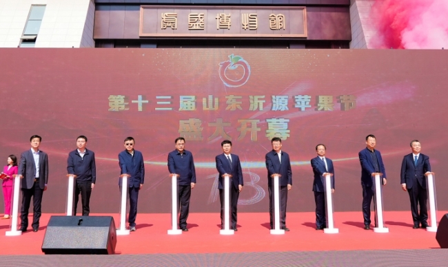 仪式开始前,与会领导和专家一同参观第十三届山东沂源苹果节展位,品尝沂源苹果及特色农产品。