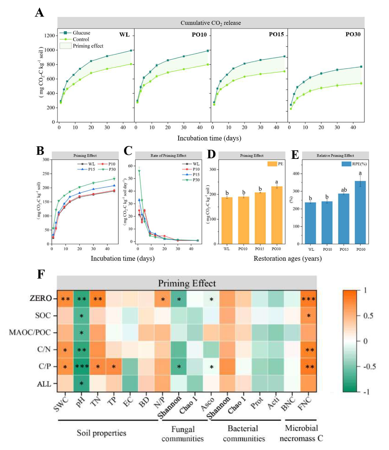 因此,本研究选取中国北方土石山区不同恢复年限(10年、15年和30年)侧柏林土壤为研究对象,通过13C标记葡萄糖溶液-土壤激发效应实验、氨基糖微生物残体碳测定实验和高通量DNA序列分析方法,测定土壤理化性质、微生物群落结构、微生物残体碳和土壤有机碳组分,并进行了45天的激发效应室内培养实验,研究探讨了不同植被恢复年限侧柏林土壤激发效应变化特征及其影响机制。研究发现,随着植被恢复年龄的增加,土壤微生物群落丰富度提高,微生物残体碳含量增加,土壤碳库趋于稳定;相对稳定的土壤碳库更容易受到外部碳输入的影响产生更强的土壤正激发效应。项目研究对于揭示森林植被恢复与防护林工程影响土壤生态系统碳平衡和碳循环原理、准确预测气候变化中SOC的动态变化具有重要指导意义。