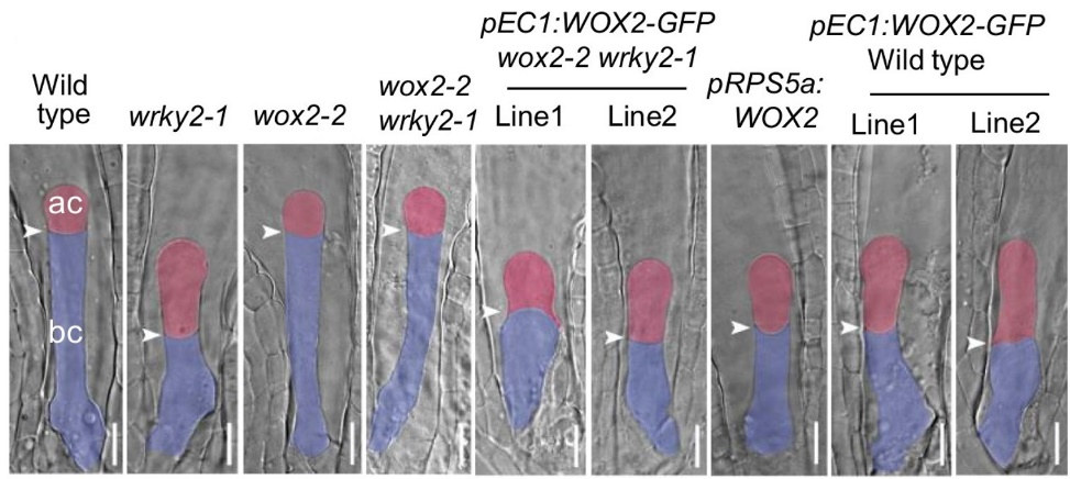 在植物胚胎发育过程中,合子的极性建立和不对称分裂是植物体轴形态建立的基础。在模式植物拟南芥中,合子通过一次不对称分裂产生一个较小的顶端细胞和一个较大的基底细胞。顶端细胞随后发育成胚胎的主体,而基底细胞则发育成为胚柄。这两者共同构成了植物的顶-基体轴;合子极性的异常会直接影响顶基轴的建立,从而导致进一步的发育缺陷。先前的研究表明,拟南芥合子极性的建立是由丝裂原活化激酶 (Mitogen-activated protein kinase, MAPK) 级联YODA-MKK4/5-MPK3/6信号通路所控制的。在此通路中,MPK3/6通过磷酸化核心转录因子WRKY2,直接激活WOX8的表达,进而调控了合子的极性建立及随后的胚胎发育过程。但在wkry2突变体中过量表达WOX8 并不能完全恢复 wrky2 突变体的合子表型,暗示可能还有参与此过程的其他成员尚未被发现。因此解析 WRKY2 下游的分子调控网络,对于深入理解合子极性建立具有重要意义。