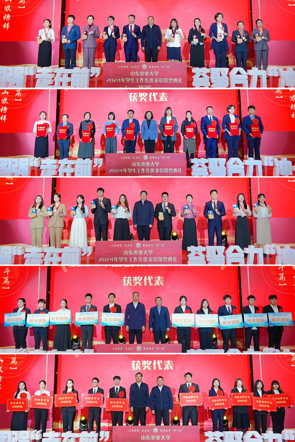 典礼总结回顾2024年全校学生工作围绕一流农业大学建设目标任务取得的优异成绩,讲述立德树人的山农故事,表彰砥砺奋进的山农榜样,彰显全校师生敢想敢为、善作善成的奋斗姿态和躬行践履、追梦圆梦的昂扬风貌。党委书记徐剑波为农学院、植物保护学院、资源与环境学院、机械与电子工程学院、经济管理学院(商学院)、生命科学学院、外国语学院、公共管理学院和信息科学与工程学院9个获评“学风建设先进单位”颁奖。党委副书记、校长冷畅俭为2024年度“招培就”一体化育人先进个人颁奖。其他校领导,党委常委分别为学校“辅导员年度人物”,荣获省级以上表彰奖励代表,“大学生年度人物”,创新创业大赛国奖获奖代表和国家奖学金、省政府奖学金获得者代表颁奖。