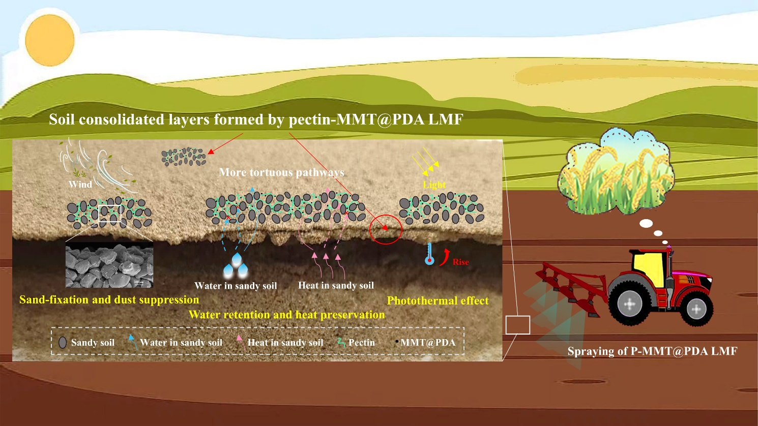 与传统的不可生物降解塑料地膜相比,天然聚合物基液态地膜具有良好的生物降解特性,可以更好的铺设在崎岖地形以应对风沙侵蚀,因而受到了广泛的关注。然而,单纯使用天然聚合物材料制备的液态地膜结构疏松,空隙较多,功能有限,这严重影响了其抗风蚀、保水和保温性能,极大的限制了其实际应用范围,尤其是在寒冷干旱的荒漠化地区。本文制备了聚多巴胺包覆蒙脱土微/纳米颗粒增强的果胶基多功能可喷涂液态地膜。多巴胺具有丰富的活性位点,其在蒙脱土表面的自聚合提高了蒙脱土与果胶链的相容性,促进了蒙脱土在果胶聚合物中的分散性,并通过氢键作用使它们更紧密地缠结在一起。因此,本研究制备的液态地膜具有更好的机械性能(提高了64.94 N)和抗风蚀性能(风速 30 m/s,大于 60 min)。此外,聚多巴胺包覆的蒙脱土微粒/纳米粒子可填充果胶链的空隙,从而提高果胶基液态地膜的致密性和网络结构的复杂性,使其具有更好的保水性(提高了 14.67 %)和保温性(提高了 3.14 °C)。同时,聚多巴胺的光热效应还赋予了该地膜良好的升温效果(升温 2.84 °C)。得益于这些特性,本研究制备的液态地膜可有效促进小麦生长,并具有良好的生物降解性。这些结果表明,在干旱和寒冷环境中应用聚多巴胺包覆蒙脱土微/纳米颗粒增强的果胶基多功能可喷涂液态地膜是一种有效的策略,有望为未来农业可持续发展和环境保护提供绿色解决方案。