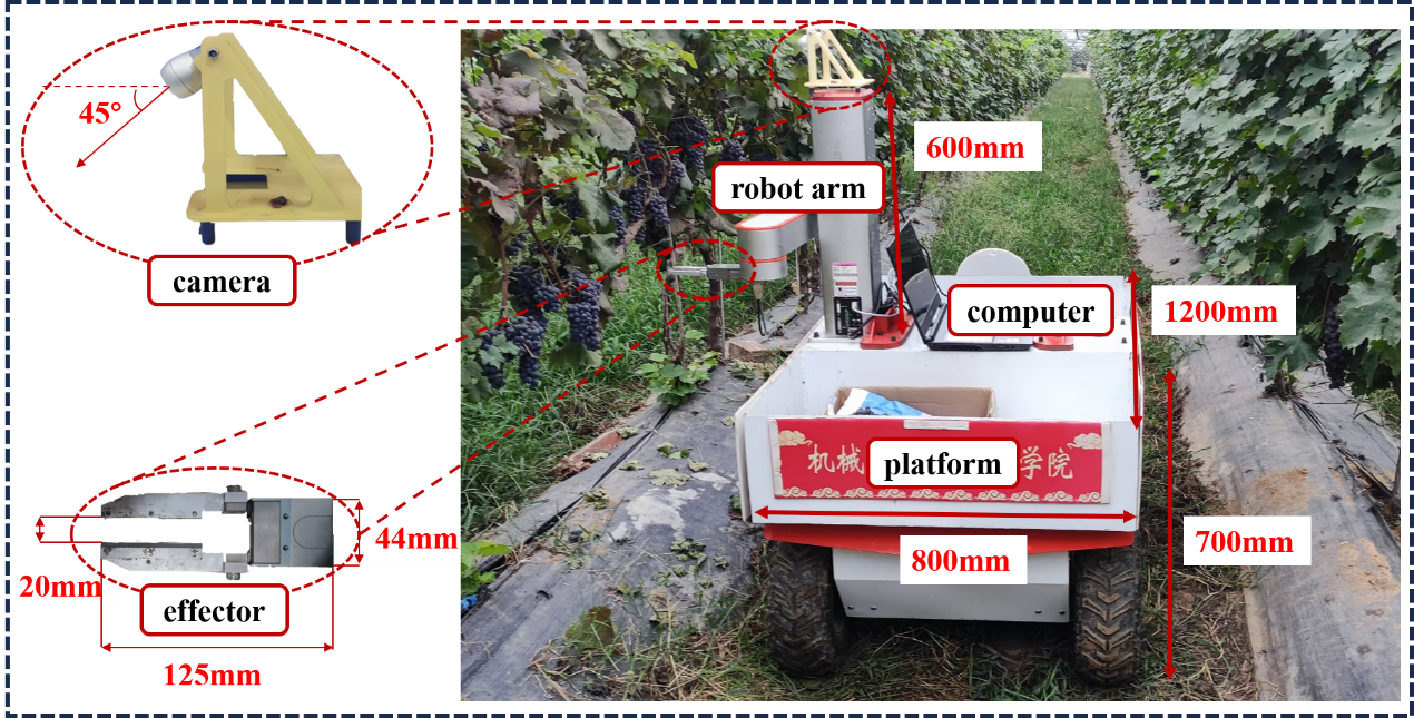 鲜食葡萄的机械化、自动化采收是降低鲜食葡萄生产成本,提高生产效率的有效途径,而传统的人工采摘葡萄存在劳动强度大、效率低等问题,严重制约着鲜食葡萄生产的机械化与自动化,针对鲜食葡萄采摘机械化与自动化的生产需求,基于鲜食葡萄采摘机器人提出一种You Only Look Once version 8 nano-Deformable Convolutional Networks-Wise Intersection over Union-Fourth Detection Layer(YOLO v8n-DWF)网络模型(如图1),设计了鲜食葡萄采摘点定位方法,实现了鲜食葡萄采摘点的快速识别与准确定位。针对自然环境中低质量数据集以及小目标难检测等问题,基于YOLOv8网络模型,融合变形卷积网络(DCN)模型、Wise-Intersection over Union version 3 (WIou v3)损失函数以及小目标检测层,提出了YOLOv8-DWF网络模型,试验结果表明提出的YOLOv8n-DWF模型的检测精度(Precision,P)、召回率(Recall,R)、平均精度均值(mean Average Precision,mAP)分别为97.9%、95.3%和97.6%,将其应用于鲜食葡萄采摘机器人(图2),平均采摘成功率为87.40%,实现了鲜食葡萄的自动采摘,为鲜食葡萄的智机械化、自动化采摘提供了坚实的理论基础。