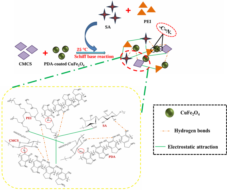 基于此,研究团队以羧甲基壳聚糖、聚多巴胺、海藻酸钠、聚乙烯亚胺和CuFe2O4为基本材料,在室温下合成了一种新型的可注射多孔磁性水凝胶(MHG)。聚多巴胺包覆的CuFe2O4作为交联剂不仅改善了MHG的均匀性、吸附性能和电催化性能,而且形成了大孔水凝胶结构。正电性的聚乙烯亚胺通过静电吸引增强了对亚硝酸盐的吸附。采用MHG修饰的玻碳电极构建的电化学传感器对亚硝酸盐的测定表现出较宽的线性范围、较低的检测限和较好的准确性。
