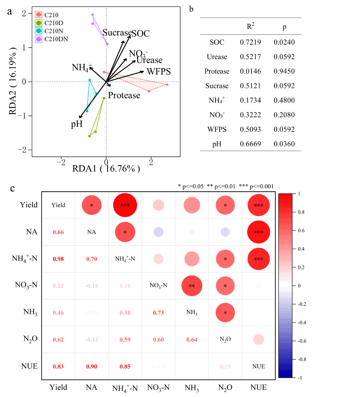 图1 土壤微生物与环境变量之间关系的 RDA, 以及产量、NUE、温室气体排放和土壤速效氮含量之间的相关性分析。(a)环境变量与微生物之间的RDA;(b) 每个环境变量的解释程度 (R2) 和显著性水平 (p); (c)产量、NUE、温室气体排放量与土壤有效氮含量之间的相关性分析。
