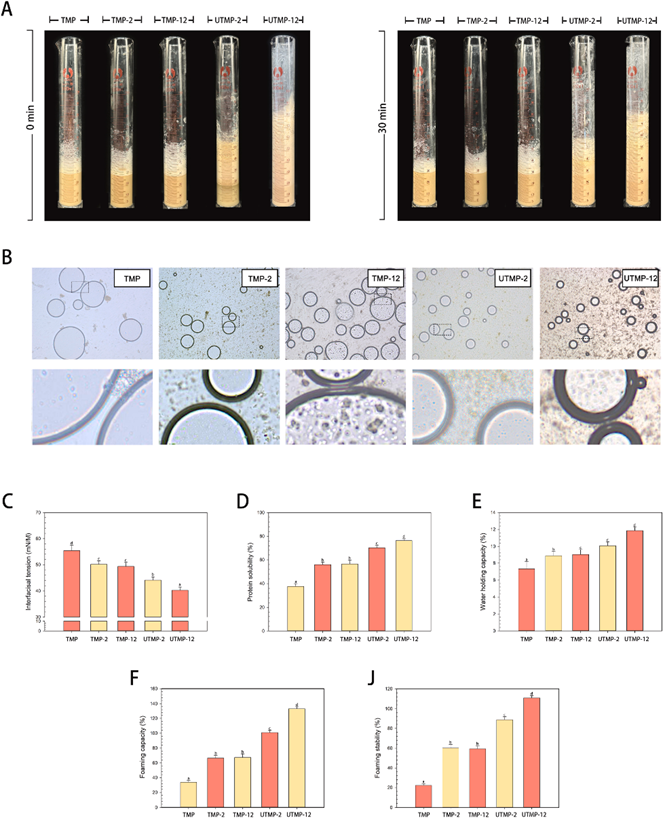 为改善TMP的起泡性能,本研究采用了极端pH值调节联合高强度超声(High-Intensity Ultrasound, HIUS)处理的方式对其进行改性。研究结果表明,在强碱性条件下,TMP对HIUS的响应更为显著。在该条件下,蛋白质分子发生解折叠,超声产生的空化效应破坏了大量非共价键,导致大量可溶性聚集体解离,从而减少了蛋白质粒径,暴露出疏水基团,提高了表面疏水性,并增加了游离巯基含量。此外,改性处理还改变了TMP的二级和三级结构:α-螺旋含量增加,而β-转角和β-折叠含量减少。这些结构变化提升了蛋白质在水-空气界面的界面性能,使得改性后的蛋白(UTMP-12)表现出优异的起泡性能。本研究为TMP在充气食品中的应用提供了一种新的思路和方法。