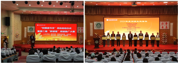 4月22日,学校举办2025年“校园读书月”活动启动仪式暨第二届“耕读者”阅读推广大赛。党委常委、副校长周玉玺出席活动并讲话。启动仪式同时表彰了2024年度“阅读先进集体”和“大学生阅读之星”。经过评选,马克思主义学院等10个单位获“阅读先进集体”荣誉称号,刘军训等30名同学获“大学生阅读之星”荣誉称号。