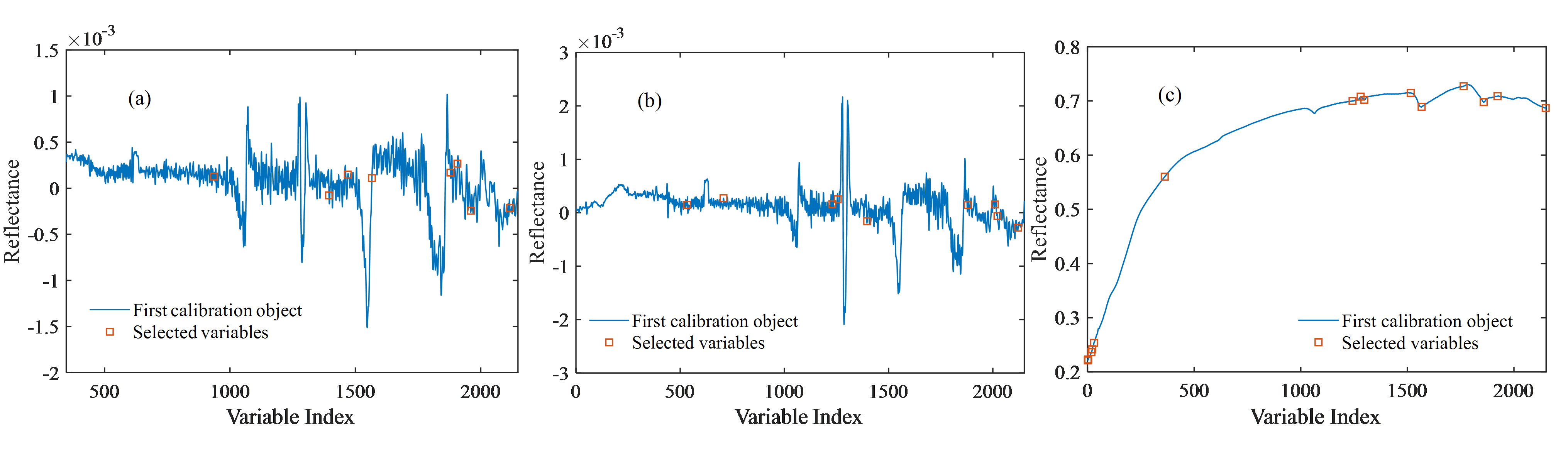图2 基于SPA的土壤中氮(a)、磷(b)、钾(c)特征提取结果