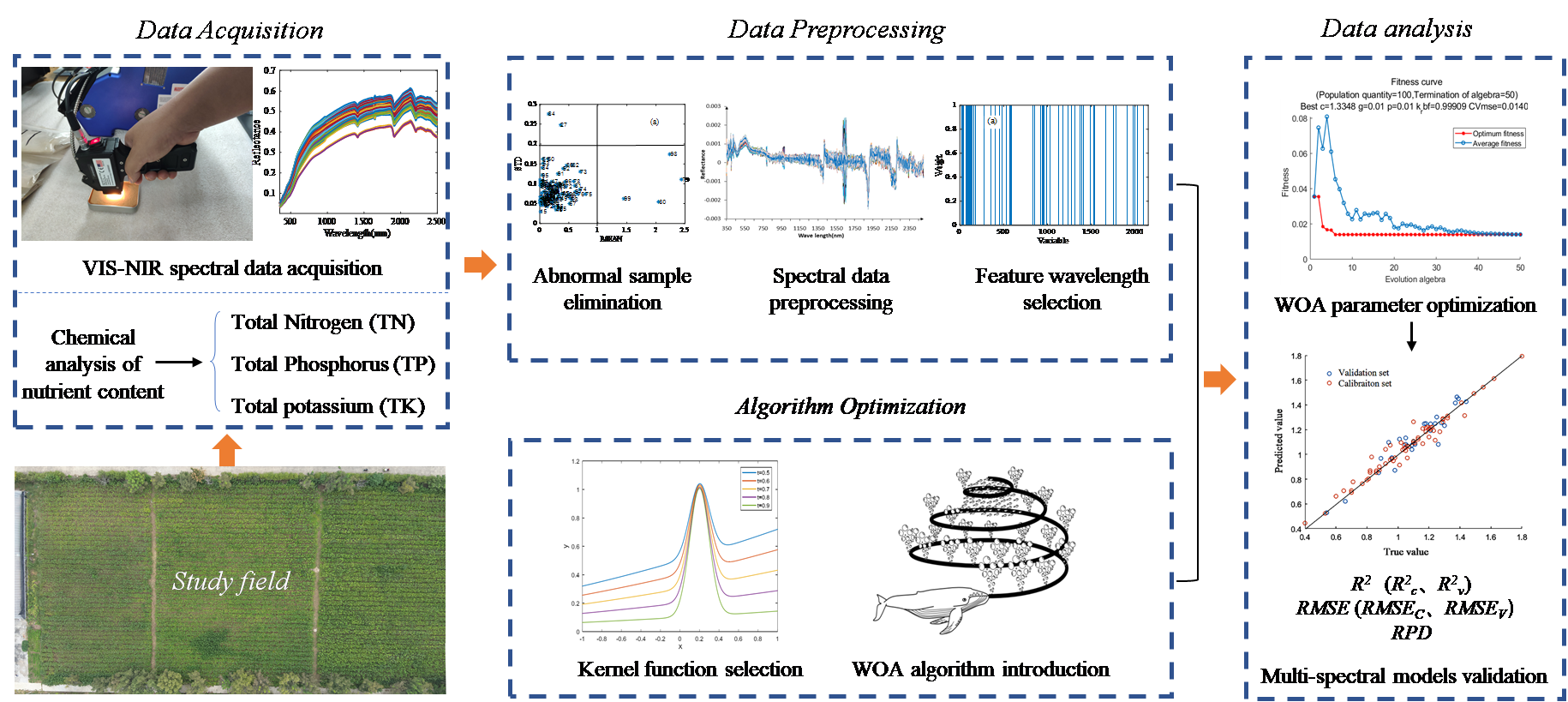 针对以上技术难题,研究团队采用可见-近红外光谱(Vis-NIR,350–2500 nm)检测手段,开发一种基于机器学习算法的快速、低成本、高精度的土壤营养成分检测方法,特别针对总氮(TN)、总磷(TP)和总钾(TK)的精准测定,助力现代化精准农业的发展。具体的,本研究采用融合径向基核函数(RBF)与多项式核函数(Poly)的RBF-Poly混合核函数,联合支持向量机(SVM)定量预测算法,构建土壤中总氮、总磷、总钾等养分的定量预测模型。引入鲸鱼优化算法(WOA)优化模型中g(核函数参数)、c(惩罚因子)和γ(权重系数)参数,优化模型预测结果。研究结果表明,对于TN、TP和TK的最优模型验证集预测结果分别为0.902、0.937和0.904,模型剩余预测偏差分别达到3.206、3.939和2.608,为准确、无损检测土壤养分提供了稳定可靠的预测模型。该研究成果在农业与环境管理实践中具有重要应用价值,有助于实现更高效、更准确的土壤养分监测与管理。