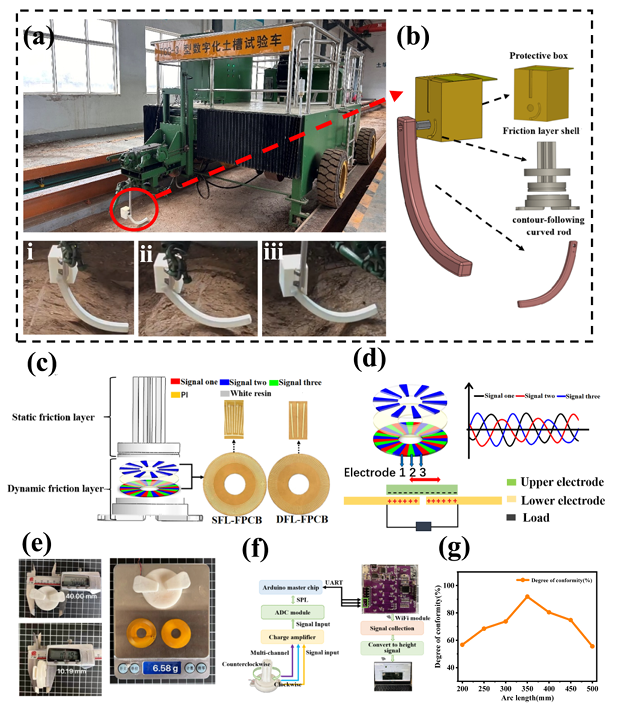 针对以上技术难题,团队研制了一种基于摩擦纳米发电机的自驱动指插式旋转摩擦电角度传感器(SFRTAS),与仿形杆相连,仿形杆随地表轮廓高度变化发生摆动,仿形杆摆动角度由SFRTAS实时检测,通过建立地表轮廓高度与仿形杆摆动角度间的数学模型,实现地面轮廓变化的精准仿形,并在实际大田环境中试验应用。
