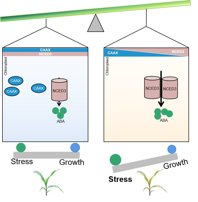 研究团队首先通过精细定位和RNA-seq技术确定了ZmCAAX是叶黄突变体yp1的候选基因。转录组结果显示ZmCAAX突变影响了类胡萝卜素的降解和ABA的生物合成。进一步研究发现ZmCAAX与ABA合成酶ZmNCED3相互作用调并影响其蛋白稳定性,本研究在玉米中首次鉴定到了ZmNCED3的上游调控因子,并解析了ZmCAAX参与调控ZmNCED3降解的分子机制。对叶绿体蛋白降解与环境胁迫之间的关系提供了理论基础。通过基因编辑ZmCAAX基因或选择ZmCAAX的自然变异等位基因,可以显著提高植物的抗旱能力和总类胡萝卜素含量。为玉米在干旱胁迫下实现资源优化分配提供了新思路。通过靶向调控ZmCAAX的表达,有望在籽粒营养品质提升与抗旱育种之间实现精准平衡,助力培育兼具高产、耐旱与营养品质优良的玉米新品种。