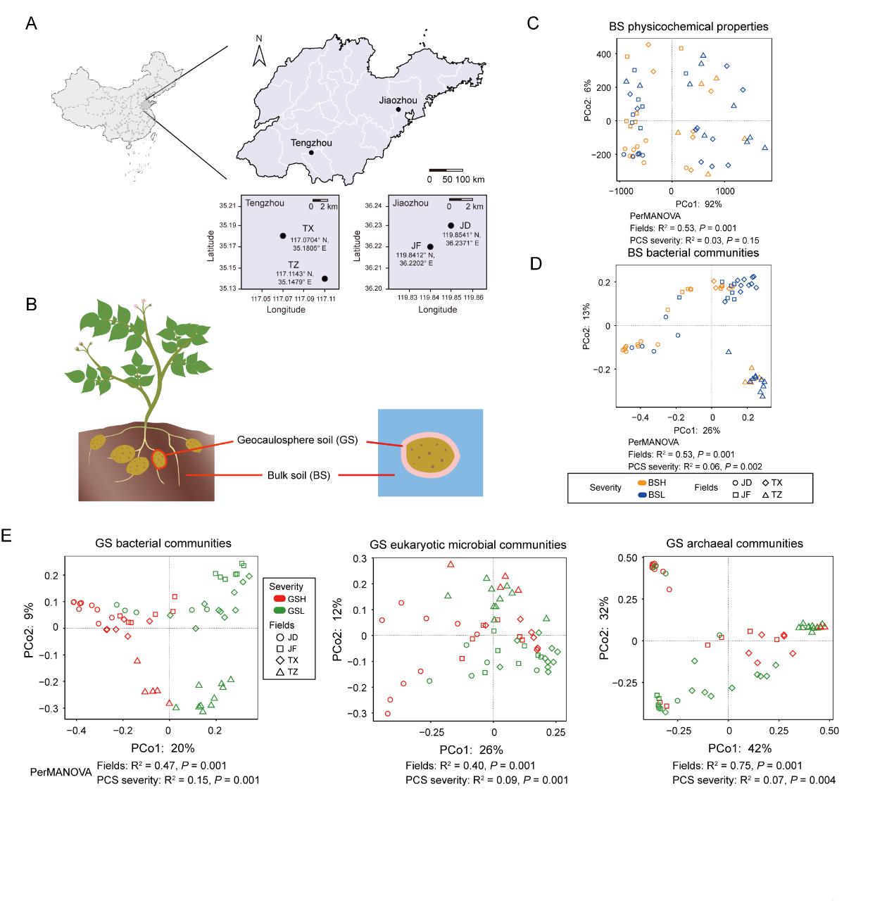 植物健康状况受病原菌丰度、土壤微生物群落组成及土壤理化特征等多因素综合影响。近日,生科学院高峥、周波团队联合农学院宁堂原团队在npj Biofilms and Microbiomes期刊发表题为《Geocaulosphere soil bacterial community drives potato common scab outcomes beyond pathogen abundance》(马铃薯块茎表皮土壤细菌群落对疮痂病发病程度的影响超越病原菌丰度)的研究成果。通过整合微生物组分析与培养实验,研究揭示了马铃薯疮痂病发生与土壤微生物组稳定性受损的关联机制:①疮痂病病害导致块茎表皮土壤细菌α多样性显著下降(Shannon指数降幅11.66%),群落构建随机性增强;②细菌群落结构对疮痂病发生的解释力(39.28%)远超病原菌丰度贡献(14.39%),凸显微生物组整体稳定性对土壤健康的关键作用;③薯块表皮土壤微生物互作呈现双重模式:病原菌与有益菌同步消长,以及随机性主导整体群落而确定性主导特化亚群。④发病薯表土壤富集了寡养单胞菌、黄杆菌、鞘氨醇单胞菌等有益微生物,大田实验证明富集的有益微生物显著降低疮痂病病级、提高马铃薯产量。这些结果提出了一个微生物稳定性框架,强调马铃薯疮痂病的发生主要由群落水平动态变化驱动,而非单纯的病原菌增殖。