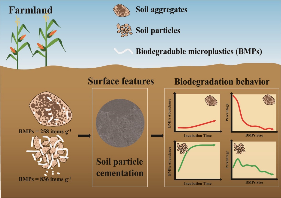 随着可降解塑料作为传统塑料的替代品被越来越多的使用,可降解塑料在环境中的降解行为与生态风险日益受到关注。相较于传统塑料,可降解塑料在土壤中的不完全降解会导致更严重的微塑料污染。然而,目前关于可降解塑料在土壤中的降解行为仍然缺乏系统研究。因此,本研究通过田间原位降解实验,探讨了可降解微塑料(BMPs)在土壤团聚体中的表面特征和生物降解行为。
