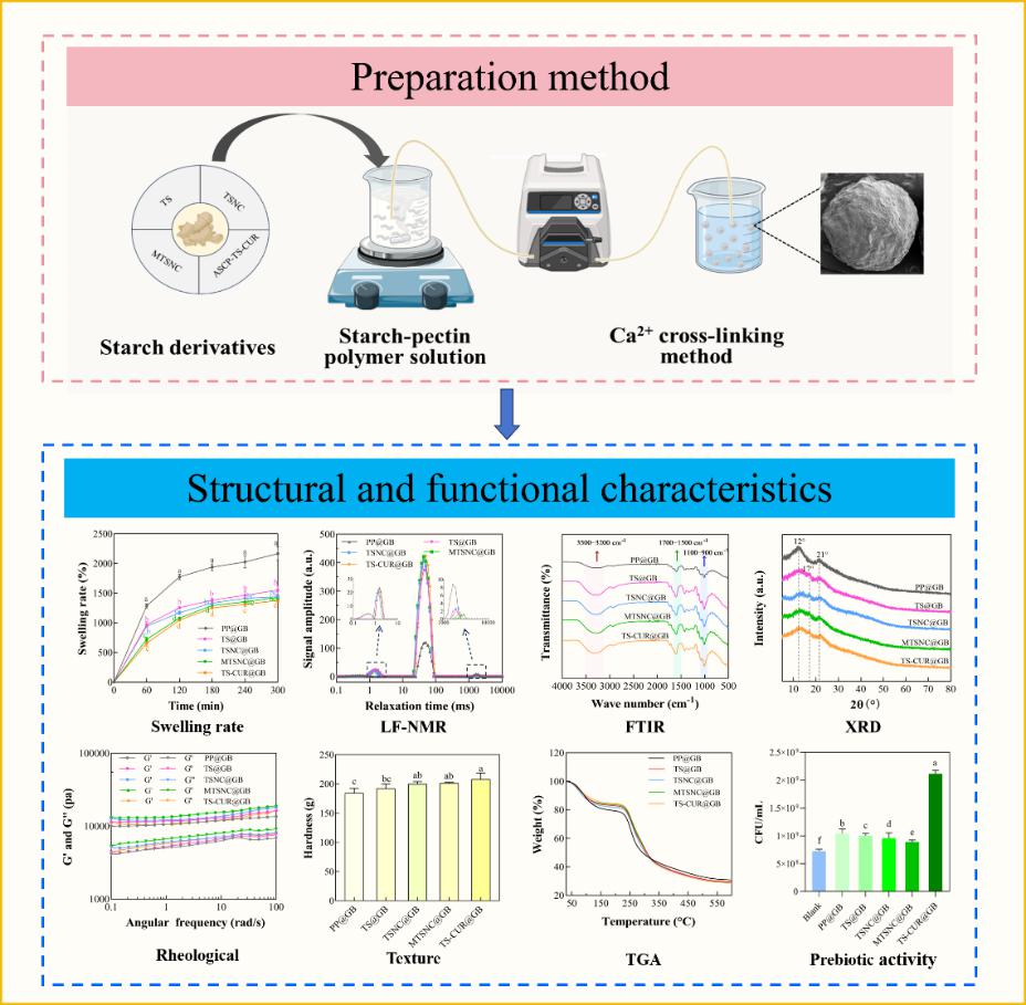 团队将上述淀粉基材料与果胶结合,通过钙离子交联技术,开发出一系列结构增强型复合凝胶珠。复合凝胶珠的硬度、弹性、咀嚼性等质构特性均得到改善,热稳定性也有所增强。含有姜黄素的复合凝胶珠在体外益生实验中表现出优异的益生元活性,能显著促进植物乳杆菌Lp3a的生长,菌落数较空白组提升2.92倍。该系统不仅具备良好的机械性能和控释潜力,还兼具促进肠道健康的益生功能,展现出在功能性食品与医药载体中的广泛应用前景。