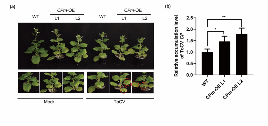 研究发现,在本氏烟中表达ToCV的次要外壳蛋白基因CPm可诱导植株出现叶脉加深、叶片黄化等典型ToCV感染症状,且植株中的病毒积累量较野生型(WT)显著升高,表明CPm是ToCV的一个关键致病因子。