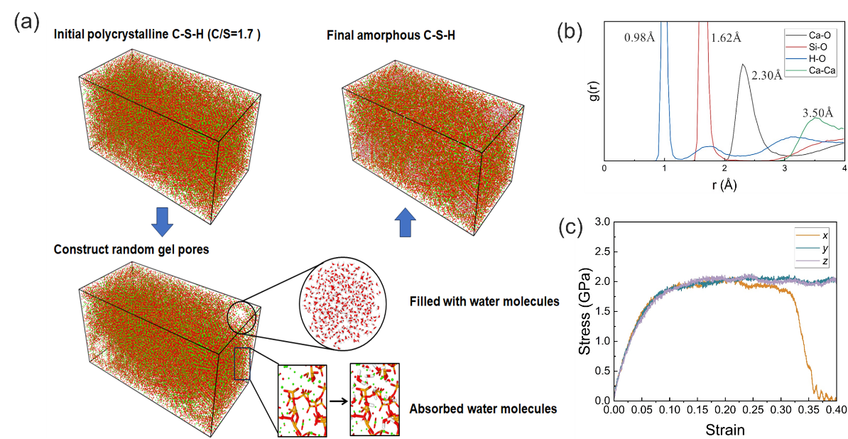 基于该势函数的高精度和高效率,成功将其应用于大规模MD模拟。不仅精确预测了托贝莫来石的拉伸力学行为和各向异性的热导率,展现了其处理复杂物理特性的多功能性。更重要的是,将该模型成功扩展到非晶C-S-H系统(图2)。构建了包含凝胶孔隙和水分子的超11万个原子的C-S-H模型,并准确预测了其RDF和力学性能,证明了该NEP-ZBL框架在模拟真实、复杂水泥基材料方面的强大潜力和鲁棒性。
