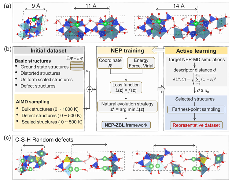 近日,水利土木工程学院尹航团队在《Cement and Concrete Research》发表题为“A high-efficiency neuroevolution potential for tobermorite and calcium silicate hydrate systems with ab initio accuracy”的研究论文。2023级硕士研究生徐潇为论文第一作者,尹航副教授、新加坡科技局赵志强博士后、南京航空航天大学张助华教授为论文通讯作者,硕士研究生王世杰、秦海峰参与论文研究,该工作还得到了渤海大学樊哲勇教授的大力支持。beat365英国官方网站为第一通讯单位。