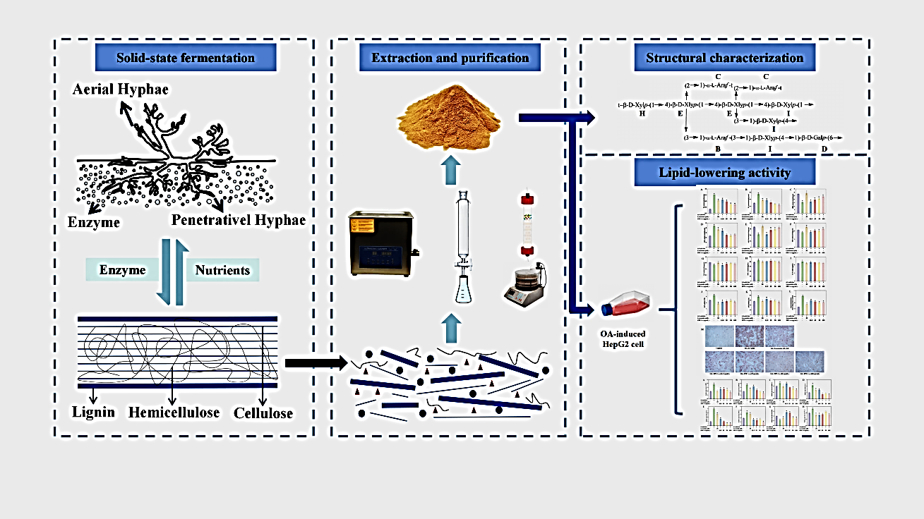 小麦果皮是麸皮的最外层,富含阿拉伯木聚糖等功能性成分,具有预防慢性疾病的潜力,但目前多被用作低值动物饲料。研究团队创新性地采用灵芝对小麦果皮进行固态发酵,系统解析了发酵过程中灵芝胞外酶系的动态变化及其对营养成分释放与底物理化性质的影响,并从发酵产物中分离纯化出一种结构新颖的多糖。进一步研究发现,该多糖能显著改善油酸诱导的肝细胞脂质堆积、氧化应激和炎症反应,并揭示了其通过调控关键脂质代谢基因表达来实现降脂作用的途径。本研究不仅为麸皮的高值化利用开辟了新思路,也为真菌发酵工艺优化和相关健康产品开发奠定了坚实的理论基础。