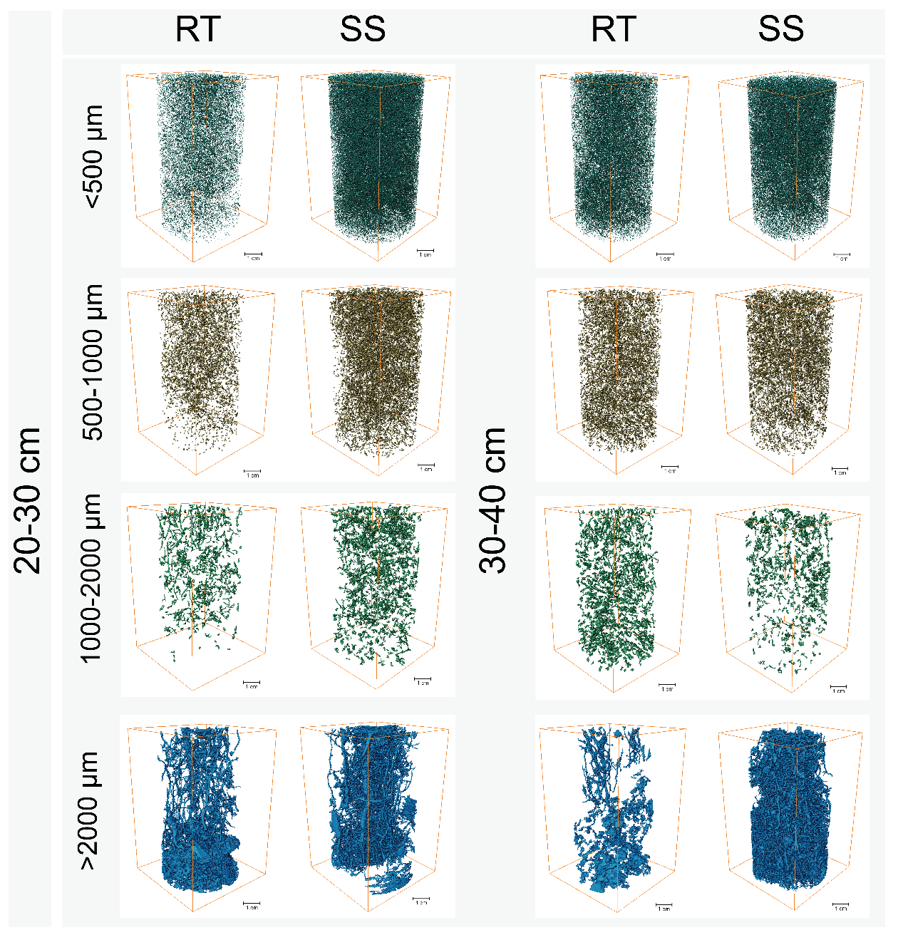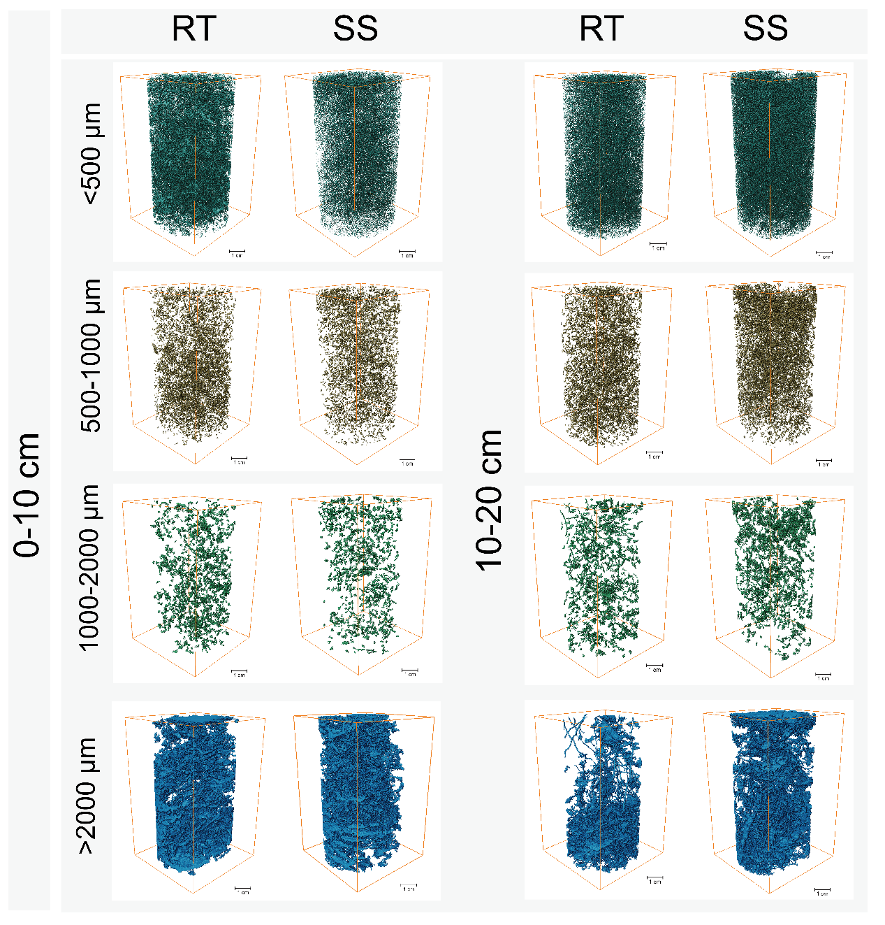 0-40cm土层土壤孔隙的三维可视化展示(RT和SS分别代表旋耕和深松)