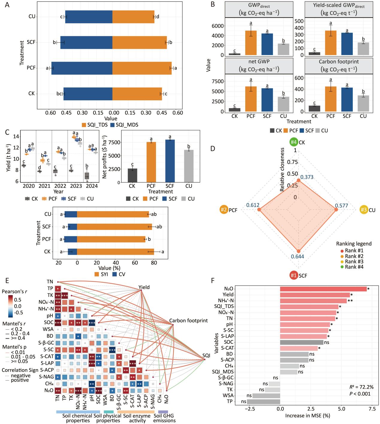 在产量与经济效益方面,PCF和SCF处理的产量分别较CU提高4.5%和6.3%,累计净收益分别高出24.3%和31.5%,展现出显著的增产增收优势。然而在产量稳定性方面,SCF处理的可持续产量指数(SYI)优于PCF。在土壤质量方面,PCF处理表现最为突出,其SQI较SCF和CU处理分别提升8.7%和41.1%。与CU处理相比,PCF处理显著提高了蔗糖酶(S-SC)、亮氨酸氨基肽酶(S-LAP)、酸性磷酸酶(S-ACP)等多种土壤酶活性,同时显著增加了土壤养分含量并降低了土壤容重,有助于长期维持与提升土壤肥力。在碳足迹方面,PCF和SCF处理的累积N2O排放量分别比CU处理高出114.3%和88.9%,从而增加了直接全球变暖潜势(GWPdirect)和碳足迹。TOPSIS多准则分析将各处理综合排名为SCF > PCF > CU > CK,SCF处理综合表现最优。上述结果表明,硫包衣尿素是黄淮海平原集约化玉米生产中兼顾产量效益与环境可持续性的优选策略。未来研究应进一步将控释肥管理与其他可持续农业措施协同整合,针对不同气候和土壤条件开发更精准的施肥方案,以实现增产、固碳与减排的多目标协同优化。
