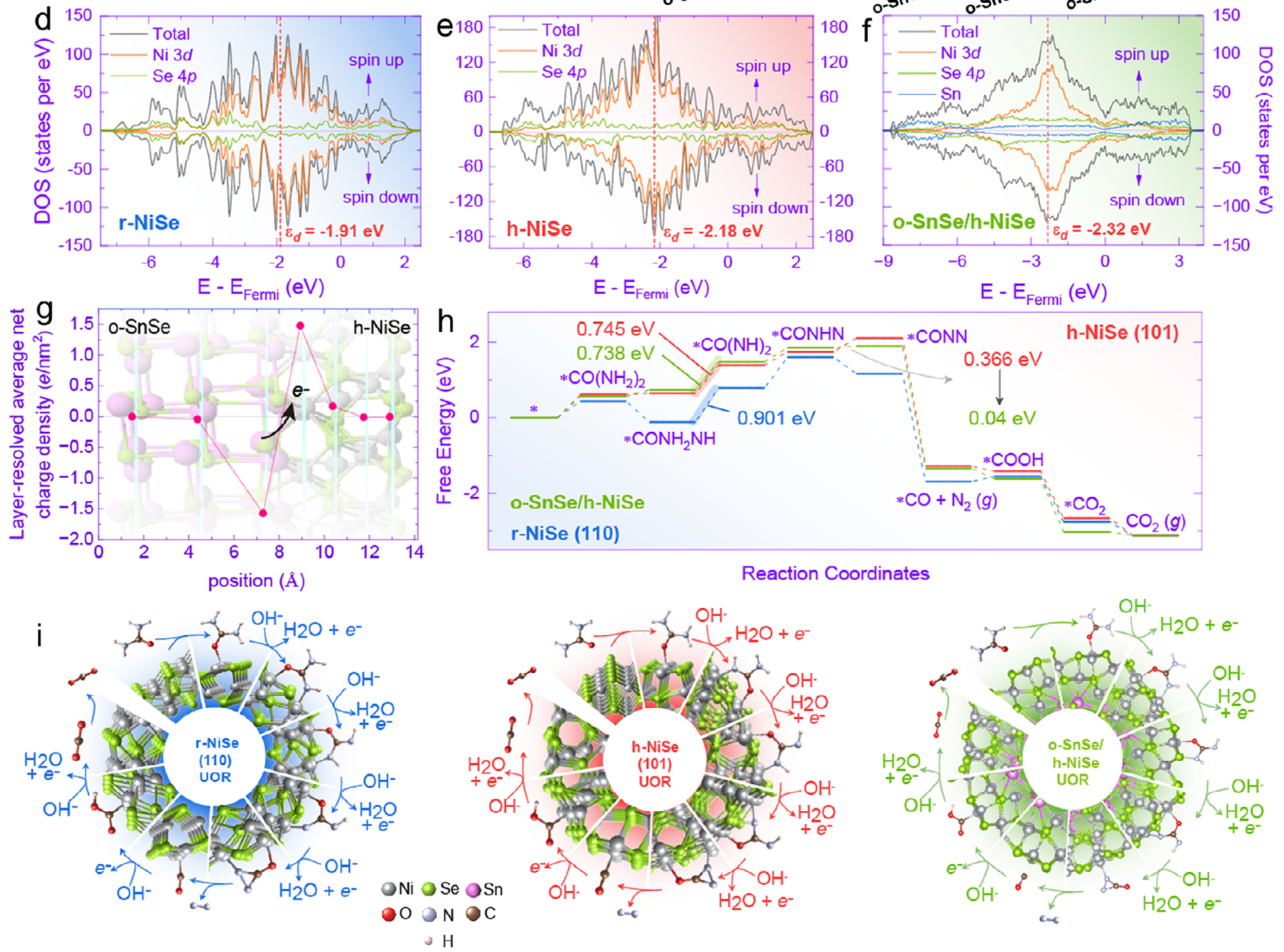 图1 理论计算揭示了h-NiSe与异质结相对于r-NiSe的UOR活性增强机制