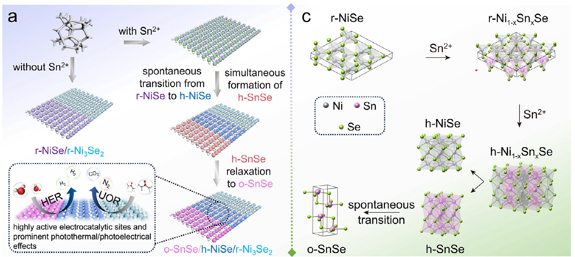 针对传统水电解能耗高及尿素氧化反应(UOR)动力学缓慢的难题,该研究创新性地利用Sn2+诱导原位相调制,成功构建了o-SnSe/h-NiSe/r-Ni3Se2三元多功能异质结构。马超副教授通过第一性原理计算,深入揭示了界面相变微观机制,并阐明了该结构显著降低UOR决速步能垒的理论依据。
