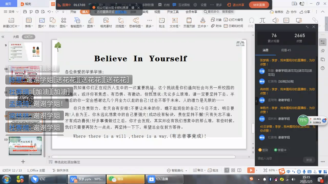 黄河科技学院本科在读、米兰milan官方网站2020届旅游英语专业毕业生李梦以时间规划、笔记整理、背诵技巧等方面进行分享。她重点指出要做真题、看错题、勤总结,勉励同学们不断提升自我,成为更优秀的人。